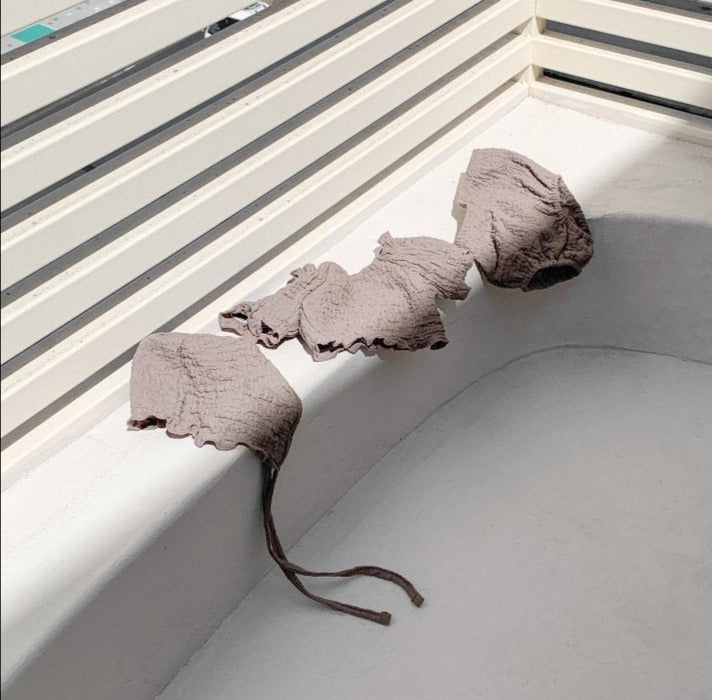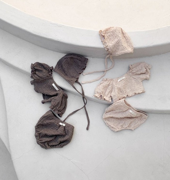 'Reef' is a gorgeous three piece bathing set featuring ruched fabric, an off the shoulder neck line, and a matching bonnet to protect your little mini's head against the sun. The fabric is very giving and comes in two earthy tones. This swim set is so versatile that it can also be worn anywhere away from the beach as a super sassy outfit.
